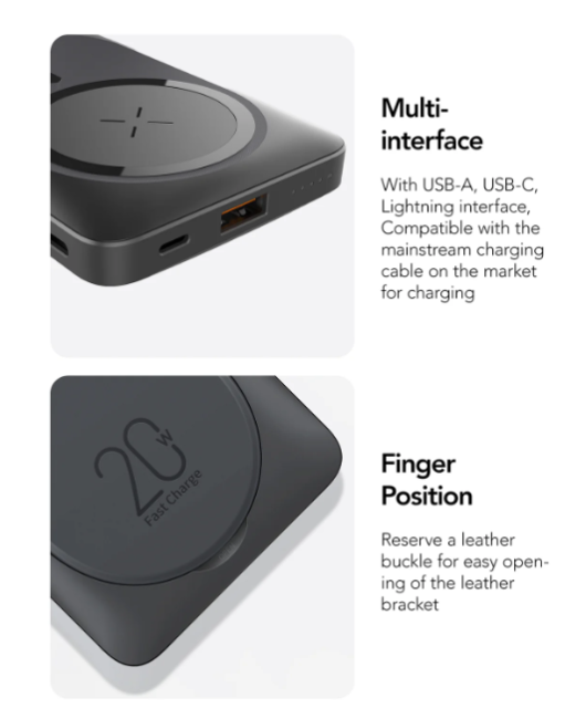 with USB-A, USB-C, Lightning interface, Compatible with the mainstream charging cables on the market for charging.